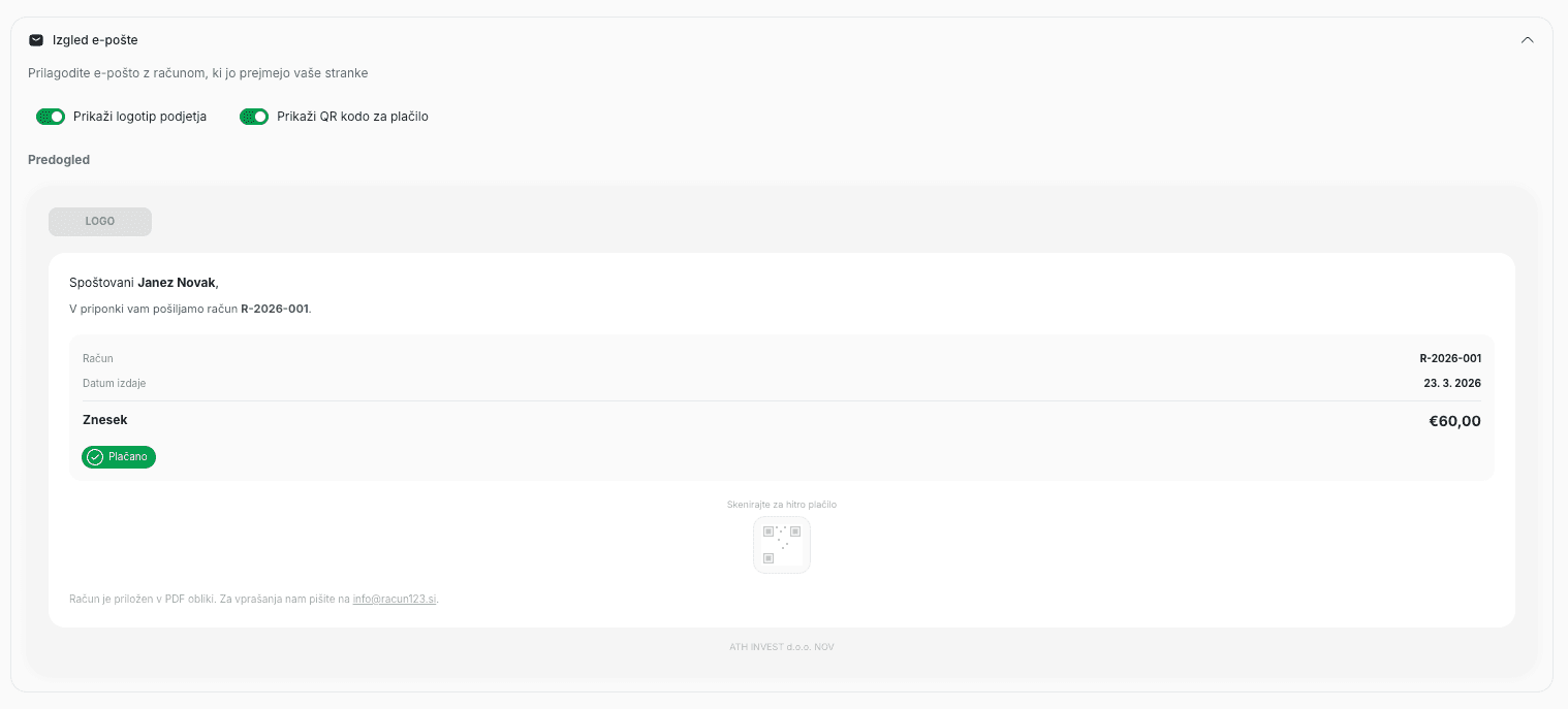 Račune lahko strankam pošiljate s prilagojenim emailom.